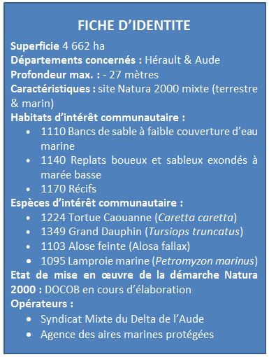 Unique site Natura 2000 mixte (terrestre et marin) du Languedoc-Roussillon, il est axé sur le cours inferieur du fleuve Aude, à l'intérieur du système de digues qui le canalise. Il inclut également un espace maritime à l’embouchure de l’Aude, délimitée dans la bande des 3 miles. Son périmètre couvre une superficie de 4 662 hectares dont 87 % en milieu marin et 3 % en milieu terrestre. En termes de connexion, ce site Natura 2000 est encadré sur la façade maritime par le site FR9102013 Côtes sableuses de l’infralittoral languedocien et également en relation au niveau terrestre avec le site Natura 2000 FR9110108 Basse plaine de l'Aude, situé en amont de sa partie fluviatile