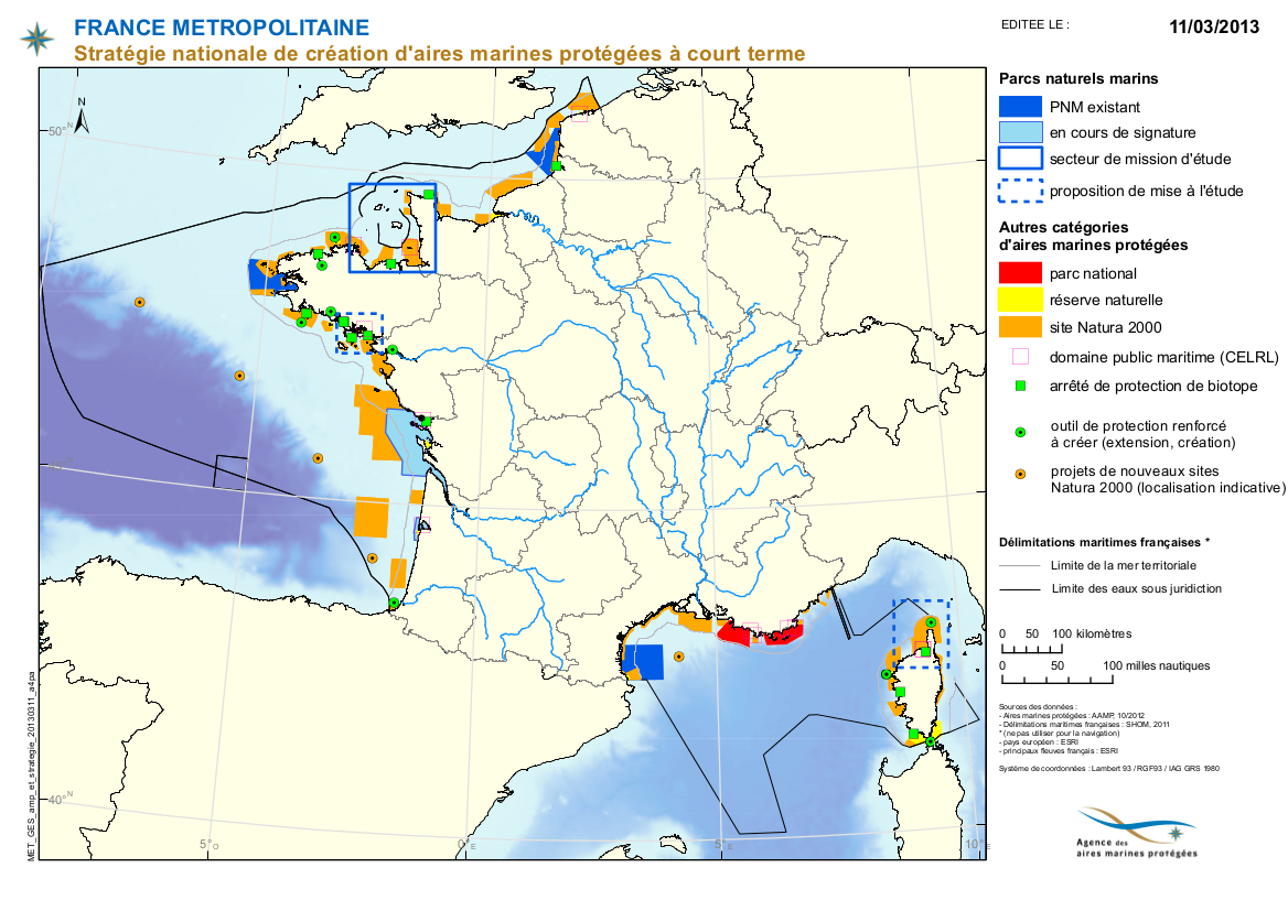 Dans la ligne directe de ses engagements internationaux et européens, la France a adopté, en novembre 2007, la stratégie nationale de création et de gestion des aires marines protégées , dont l’objectif est de créer un réseau complet, représentatif et cohérent, d’aires marines protégées d’ici à 2012, et cela avec l’appui de l’Agence des aires marines protégées (AAMP).